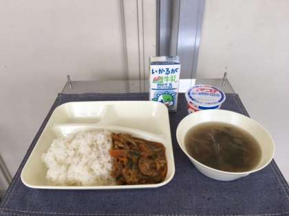献立は、和風カレー丼、もずくとオクラのとろり汁、ヨーグルト、牛乳です。