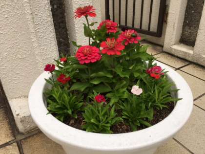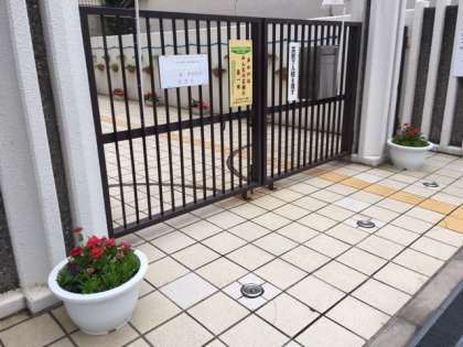 浪速区役所からいただいた綺麗なお花が正門前を飾ってくれています。管理作業員さんに植えてもらいました。来校者もにっこりです。
