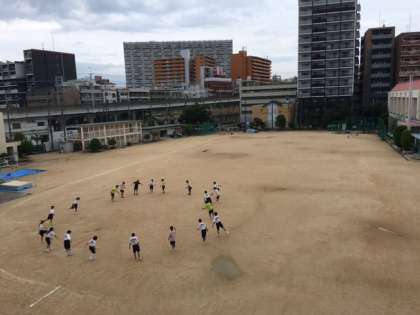 雨が上がって数時間、本校グラウンドの水はけの良さにはいつも驚かされます。ほとんど乾いて水たまりが少し残っているくらいです。陸上部がウォーミングアップをしています。