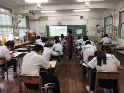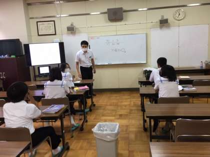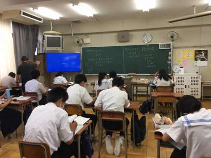 数学は、2分割した習熟度別授業です。『関数』の単元ですが、入試問題にチャレンジしています。(写真上、中)