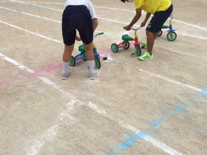 縄跳びと三輪車は、1レースごとにアルコール消毒をしています。