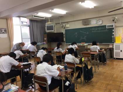 理科の中間テストは2日目、金曜日です。テストに向けて問題を解いています(写真上)