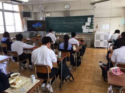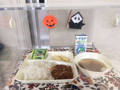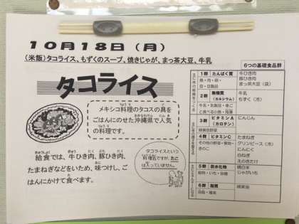 献立は、タコライス、もずくのスープ、焼きじゃが、まっ茶大豆、牛乳です。タコライスには、タコは入っていないと給食委員が放送で教えてくれました。