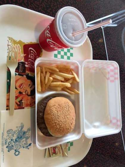 昼食は、ミルクーポンを使って食べます。写真は、メルズドライブインの、クラシックバーガーです。
