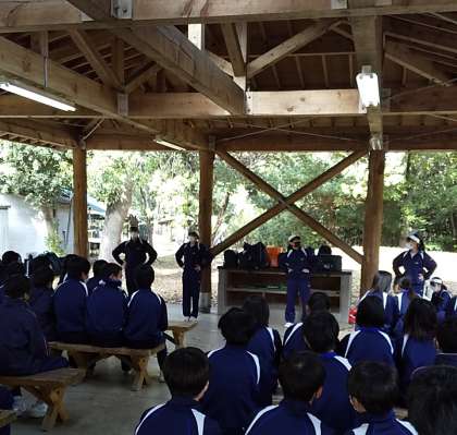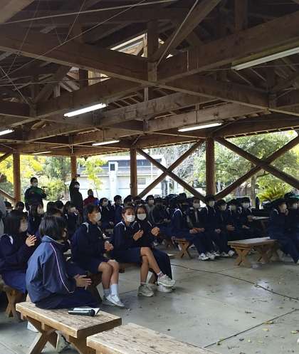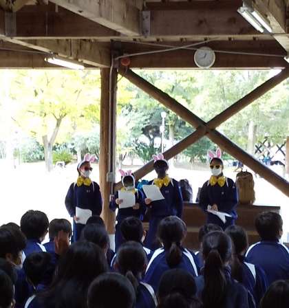 学年別でスタンツ大会が始まりました。協力して会場を作った後、司会役が盛り上げてくれてます。