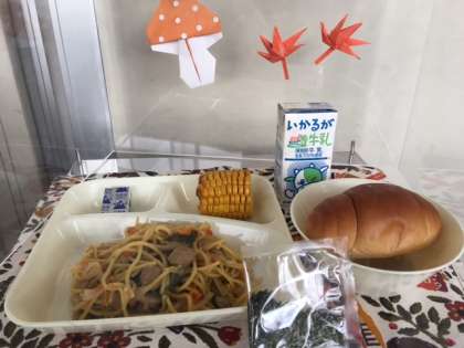 今日の献立は、ウィンナーときのこの和風スパゲッティ、焼きとうもろこし、固形チーズ、黒糖パン、牛乳です。
