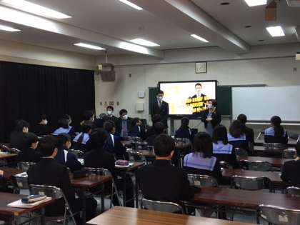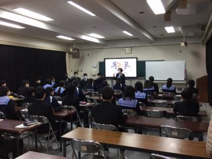 先月の3年生に続き、興国高校のみなさんに2年生対象の出前授業(マナー講座)に来ていただきました。2名の先生と3名の生徒さんの説明やお話に、生徒たちは引き込まれていきました。