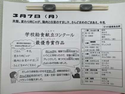 今日の献立は、緑中学校の家庭科部のみなさんが考えた献立で、学校給食献立コンクール最優秀賞を取った給食です。