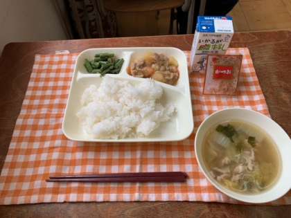 献立は、変わり肉じゃが、鶏肉と白菜のすまし汁、さんどまめのごまあえ(かつおぶし)、牛乳です。