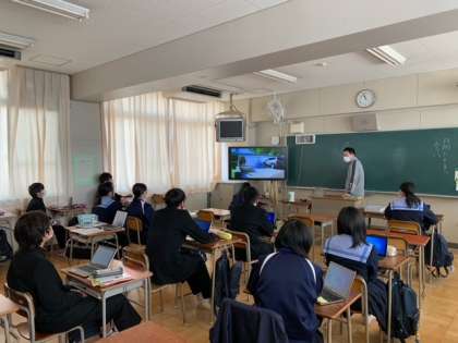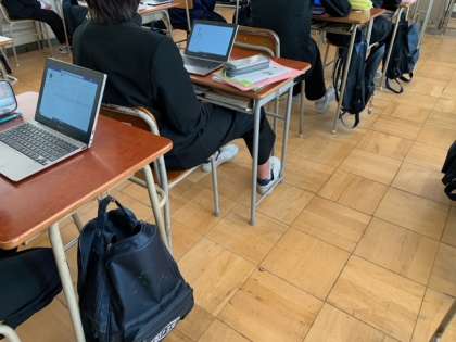 1人1台のパソコンを使って授業をしています。電子黒板では未来のガラスを使った生活を映しています。