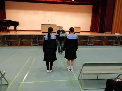 10日(木)予行を行いました。予行に先立って3年間無遅刻、無欠席、無早退の女子生徒2名の皆勤を表彰しました。よく頑張りました。