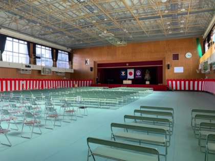 9時00分受付スタートです。新入生は9時20分頃までに登校し教室で待機してください。保護者の方は体育館へお願いします。