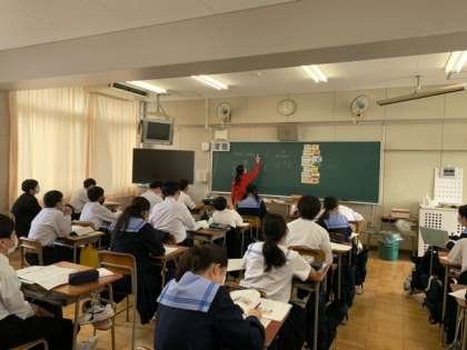 英語の授業です。夏服の人が増えました。今日(18日)から5月31日までは更衣調整期間です。夏服、冬服どちらでもかまいません。体調や気温に合わせて自分で判断してくださいね。