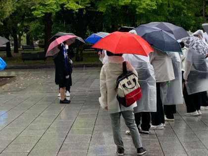 平和記念公園に入りました。原爆供養塔の前でガイドさんの話を聞いています。