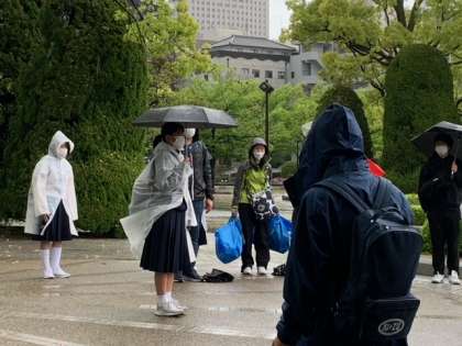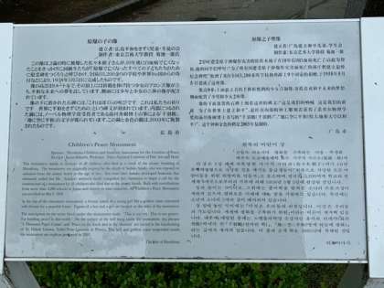 原爆の子の像の前で平和セレモニーを行なっています。代表生徒が平和に対する思いを強く語ってくれました。説明が4カ国の言葉で書かれていました。世界中の人々に知ってほしいです。