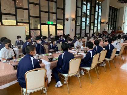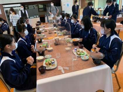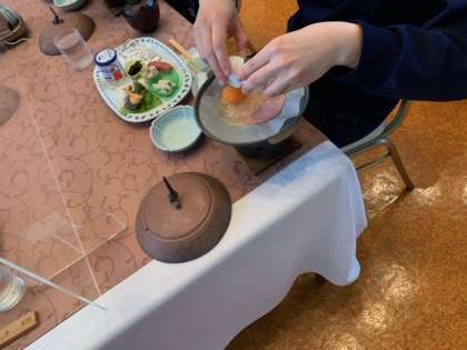 朝食です。ハムエッグは1人1人自分で作ります。米は地元の安芸太田町産のコシヒカリ、とても美味しいです。