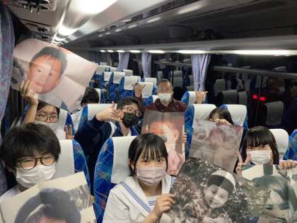 バスレクは、どちらのクラスも小さい頃の写真で先生をあてるクイズを行いました。正解を伝えると「え〜」と言う声が上がっていました。写真は2号車のものです。