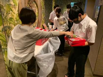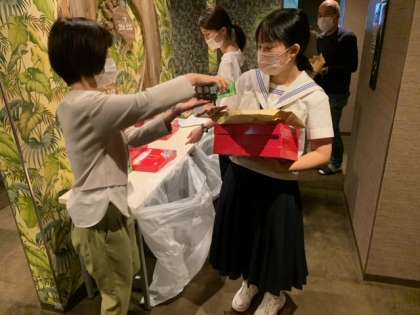 朝食配布です。今日は感染症対策のため各部屋でお弁当となります。
