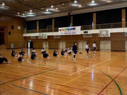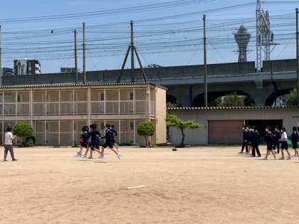 3年生体育の授業、女子はグラウンドで音楽にのせてトレーニングをしています。男子は体育館でラジオ体操のテストです。体育大会まで後1ヶ月となりました。