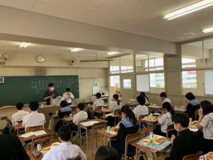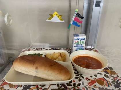 献立は、ケチャップ煮、さんどまめとコーンのソテー、りんごのクラフティ、レーズンパン、牛乳です。レーズンパンは久しぶりの登場です。