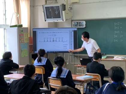 1年生の数学の授業です。距離と時間を学習していますが、デジタル教科書を使いながらでとてもわかりやすいです。たくさん手も上がっています。