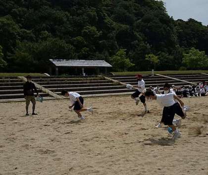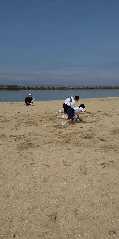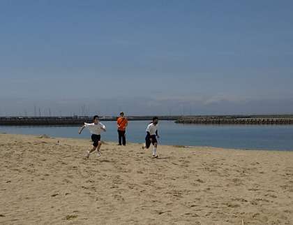 ビーチフラッグ大会、プレイヤーも応援も全力です。勝ち上がると4レースになります。
