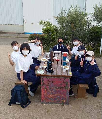 野外炊事のカレーです。早い班は調理も終わり、美味しく頂いてます。食べた感想は、「幸せです!」