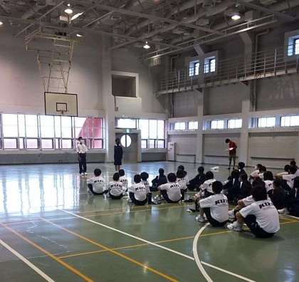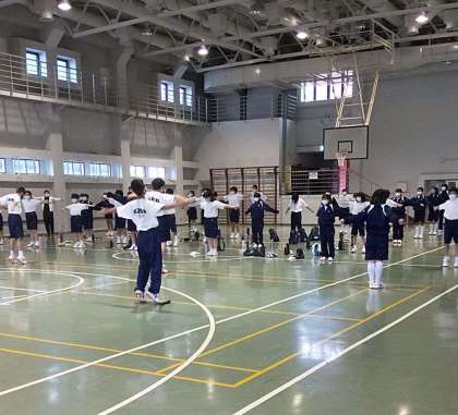 あさの集いです。雨天なので、体育館でしました。予定よりも少し早く行動が出来ています。