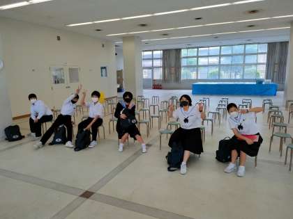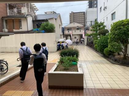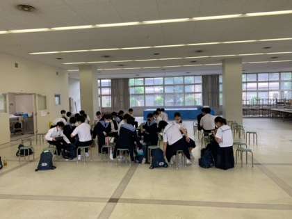 雨のため一旦学校に帰って来た班もあります。食堂でお弁当を食べてから再度出発です。