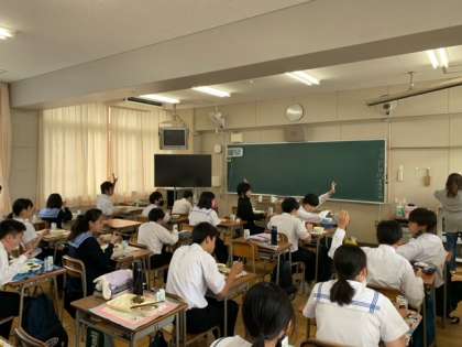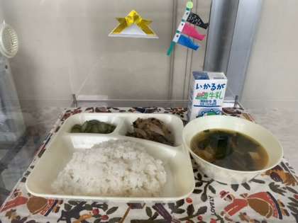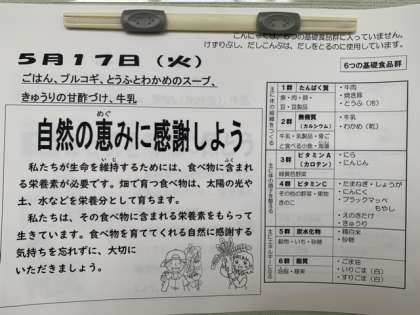 献立は、プルコギ、とうふとわかめのスープ、きゅうりの甘酢づけ、ご飯、牛乳です。おかわりの手もたくさん上がっています。自然の恵みに感謝して美味しくいただきましょう。