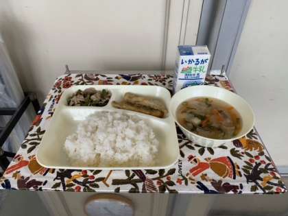 献立は、いわしてんぷら、五目汁、豚肉とさんどまめのいためもの、ご飯、牛乳です。