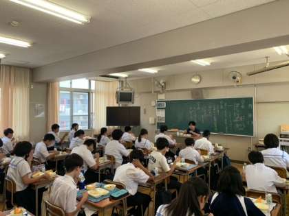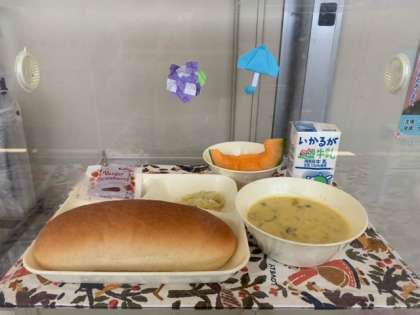 献立は、かぼちゃのクリームシチュー、キャベツのゆずドレッシング、クインシーメロン、コッペパン、牛乳です。