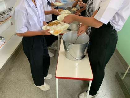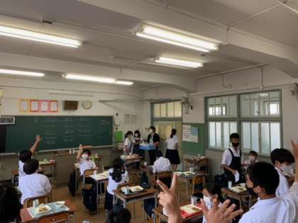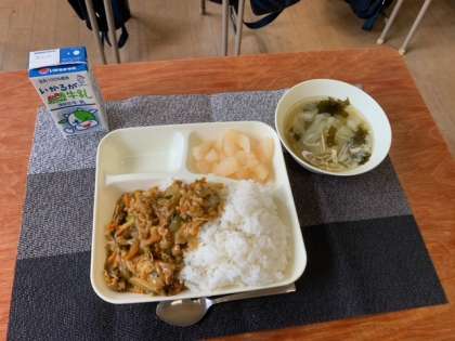 献立は、和風カレー丼、すまし汁、和なし、牛乳です。カレーのおかわりがすごいです^o^