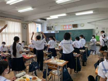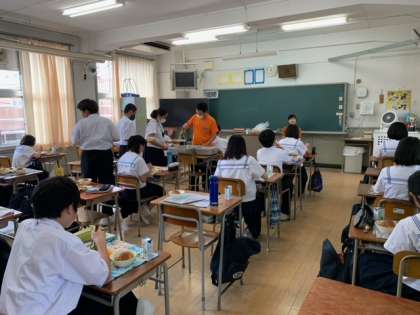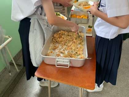 献立は、和風焼きそば、オクラの甘酢あえ、黒糖パン、牛乳、オレンジです。1年生食欲旺盛です。