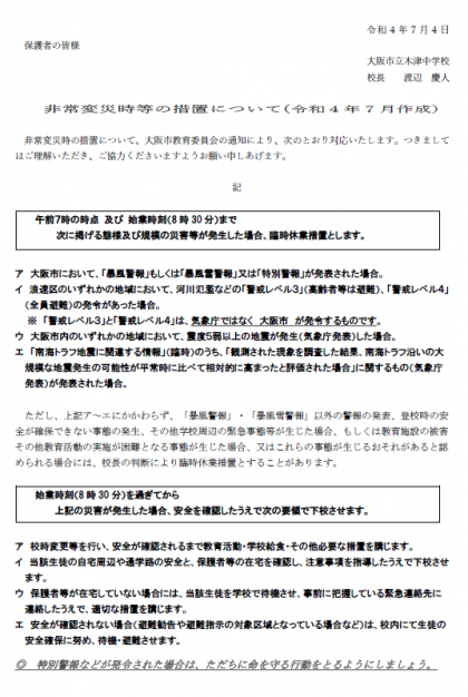 台風や地震などの「非常変災時等の措置について」は、昨年度と変更はありませんが、本日お子さまを通じてプリントを配付しています。改めてご確認いただき(大阪市教育委員会から変更通知が無い限りこのまま適用)、対応していただきますようお願い申しあげます。