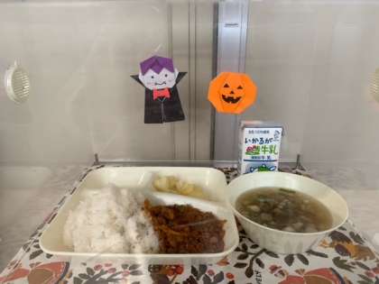 献立は、タコライス、もずくのスープ、焼きじゃが、牛乳です。