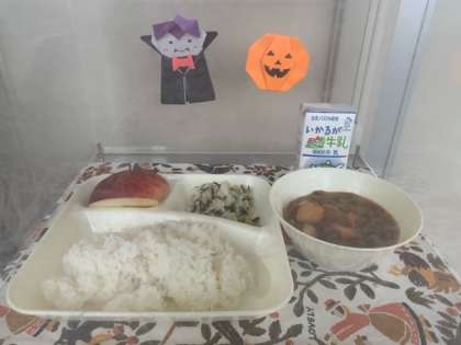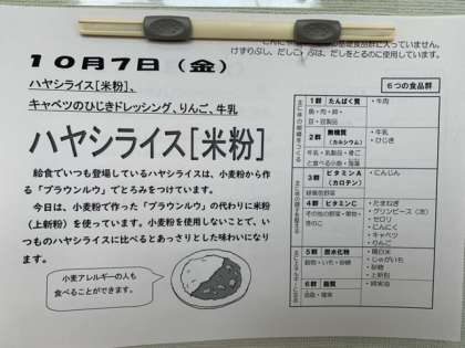 中間テストが終わりました。今日の給食は、ハヤシライス〔米粉〕、キャベツのひじきドレッシング、りんご、牛乳です。