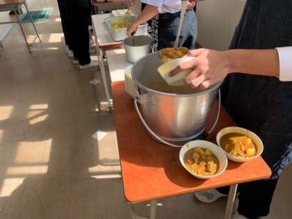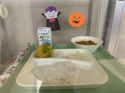 献立は、ポークカレーライス〔米粉〕、サワーキャベツ、みかん、牛乳です。