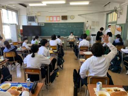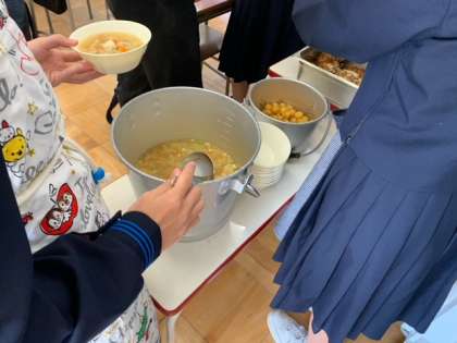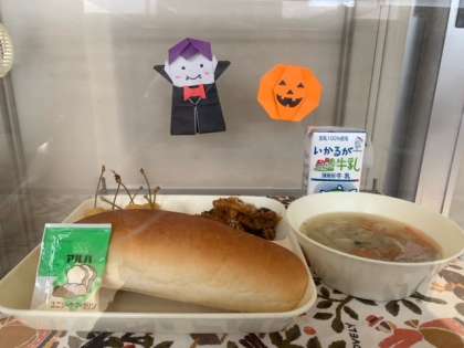 献立は、なすのミートグラタン、鶏肉と野菜のスープ、さくらんぼ(缶)、コッペパンです。
