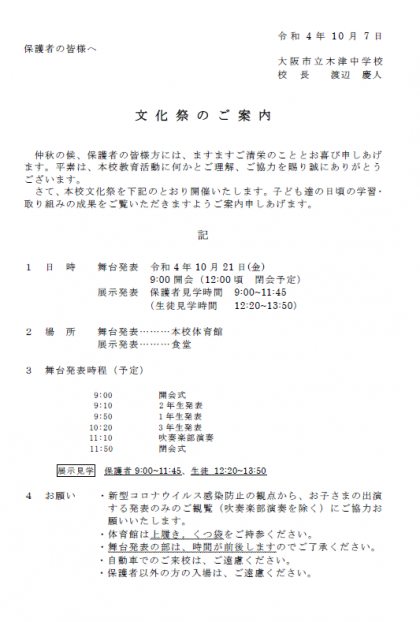 明日(10/21)予定通り文化祭を開催いたします。10月7日にお子様を通じて配付したプリントと同じ内容(こちらをクリック⇒文化祭のご案内)ですが、掲載いたします。