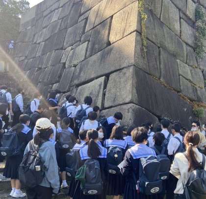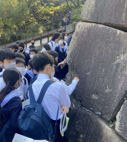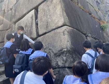 アメリカ軍が戦闘機から機関銃で撃った跡です。石垣に残る細かな穴が機銃掃射の激しさを物語っています。先生からの説明もしっかり聞いています。
