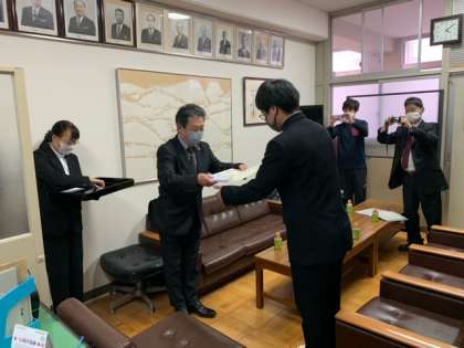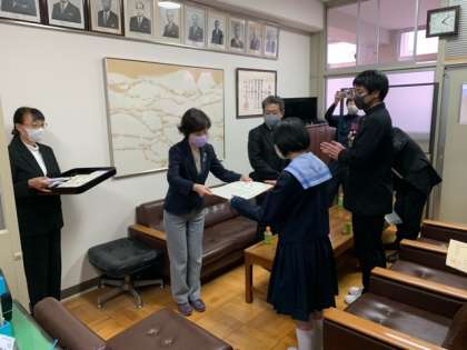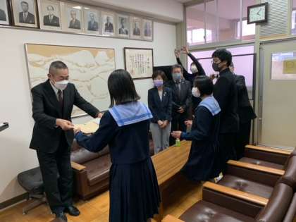 9日(金)本校校長室で「税についての作文」の表彰式を行い、3生3名が賞状と記念品をいただきました。3名のみなさんおめでとうございます。