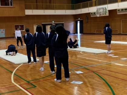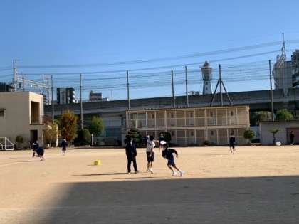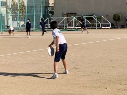保健体育男子はグラウンドでフリスビーをしています。なかなか真っ直ぐ飛びません。