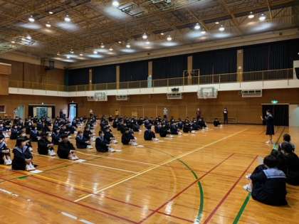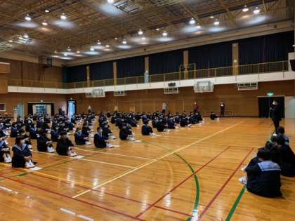 全校集会を行いました。今週3年生は中学校最後のテスト、学年末テストがあります。