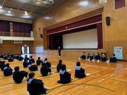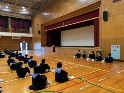 今週も始まりました。全校集会の様子です。学校長、生徒指導主事の話の後、生活委員、生徒会役員から報告がありました。