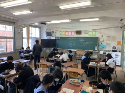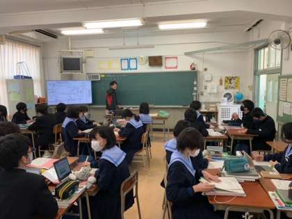 社会科の授業は、北アメリカの工業の単元です。電子黒板を使いながら重要語句を確認しています(写真上)