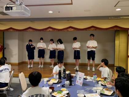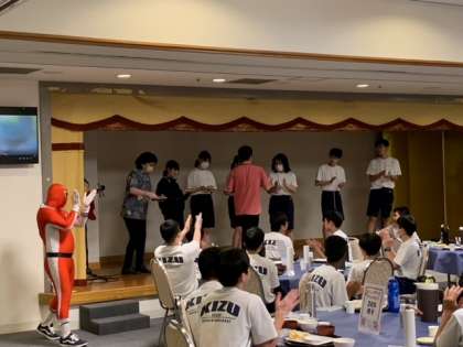 実は、これもサプライズ。この6人偶然選ばれたのではありません。今月(4月)が誕生日の6人でした。三線の伴奏による全員からのバースデーソングとホテルからのケーキのプレゼントがありました。