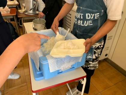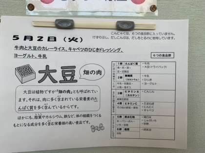献立は、牛肉と大豆のカレーライス、キャベツのひじきドレッシング、ヨーグルト、牛乳です。