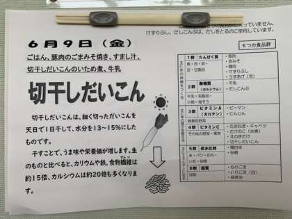 献立は、豚肉のごまみそ焼き、すまし汁、切干しだいこんのいため煮、ご飯、牛乳です。
