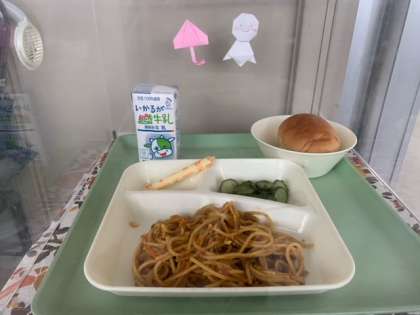 献立は、カレースパゲッティ、きゅうりのピクルス、棒チーズ、黒糖パン(2分の1)、牛乳です。